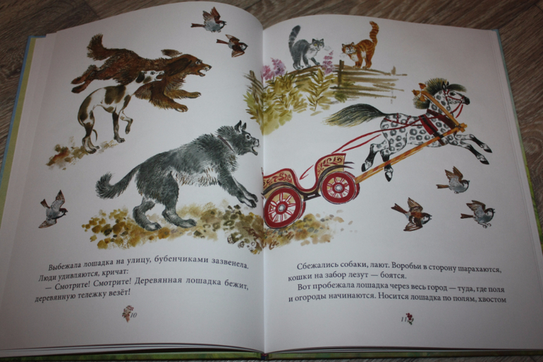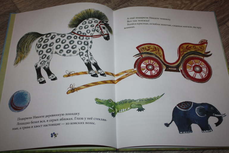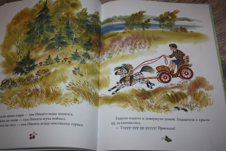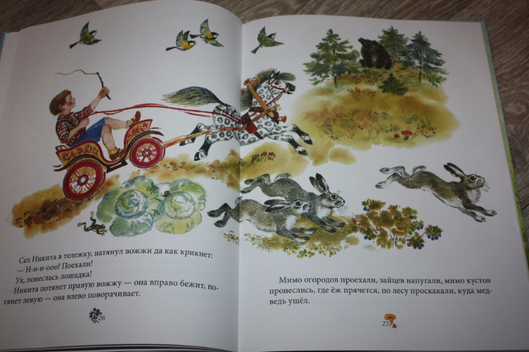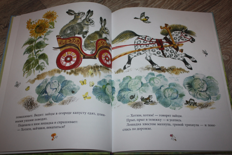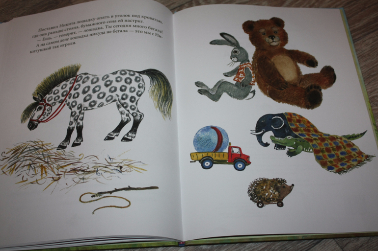 Сама история простая, можно читать совсем малышам, лет с 1,5. И конечно потом неоднократно перечитывать. Я читала сыну (3 года) и сыну подруги (4 года). Обоим история понравилась, сын так недели две почти ежедневно просил перечитывать. Никак он не поймет, что лошадка никуда не ездила, "это мы с Никитушкой так играли". А ведь дети так и играют, придумывают сюжеты и катают лошадок/машинки/куклы. Особое восхищение заслуживают иллюстрации. Мы подолгу их рассматриваем, такое все настоящее, живое, как будто оказываешься по ту сторону листа и стоишь рядом с зайчиком.