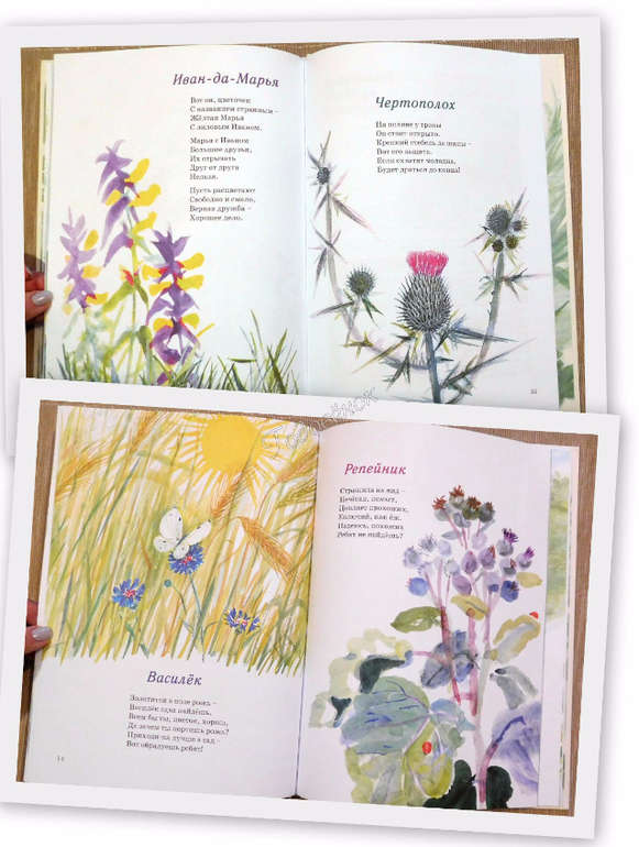 Приятные иллюстрации, простые и понятные стихи. Растения в книге те, которые ребенок может увидеть на природе каждое лето. И вроде бы всё хорошо. Но я всё же немного побрюзжу: