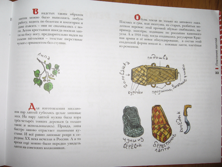 Мы с сыном, не смотря ни на что, книгой остались. Много для себя почерпнули интересного. Некоторые вещи ведь до сих пор сохранились у бабушек. Плетеные корзины, например. Каждый год мы в них с дачи яблоки возим. Ароматные такие, желтенькие. Сразу же август-сентябрь вспомнился. И ложки деревянные есть, не такие правда, не ручной работы, а серийного уже производства. Но тоже вспомнил, где видел, потом бабушке рассказывал, как их делают. Особенно долго и сильно Егор удивлялся лаптям. Все никак не мог поверить, что такую обувь можно носить. После холодов хотим в Краеведческий музей съездить. Там, насколько помню, лапти точно были. :))