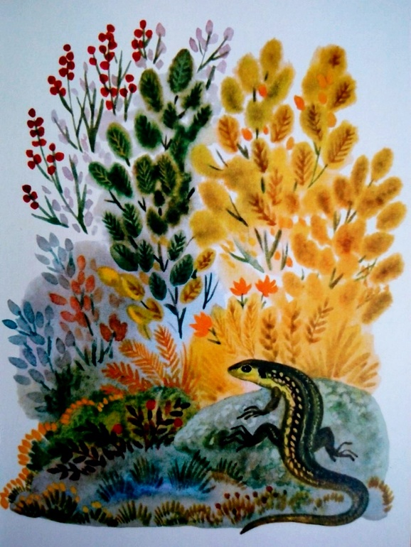 Сложно передать цвет. Иллюстрации такие яркие и одновременно очень нежные. Я очень люблю такую манеру рисования. Полюбуйтесь как горят листья на деревьях. Каждая травинка имеет свой цвет. Надеюсь, что книга вам тоже придётся по вкусу.