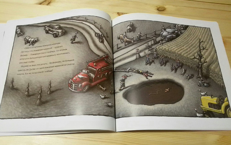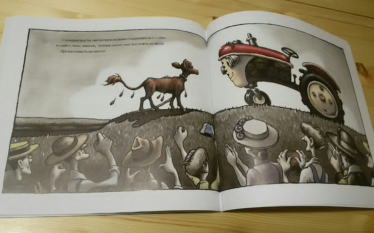 В один жаркий летний день теленок отправился к пруду, чтобы охладится. Но его ноги увязли и он не мог выбраться. Ни фермеры, ни большой желтый трактор, ни команда спасателей со своей пожарной машиной не могли помочь теленку. Они только пугали малыша и он увязал все глубже и глубже.