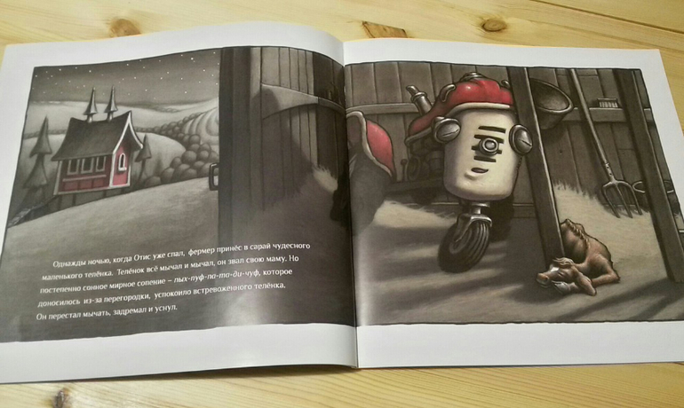 Но как-то раз фермер приехал на большом желтом тракторе. Фермер решил, что Отиса пора отправлять на покой и оставил его стоят позади сарая. Маленькому трактору было очень грустно. Грустил и теленок, ведь никто больше не урчал нежно, чтобы его убаюкать. Он часто сидел рядом с другом, но Отис больше не играл с ним, как в прежние дни.