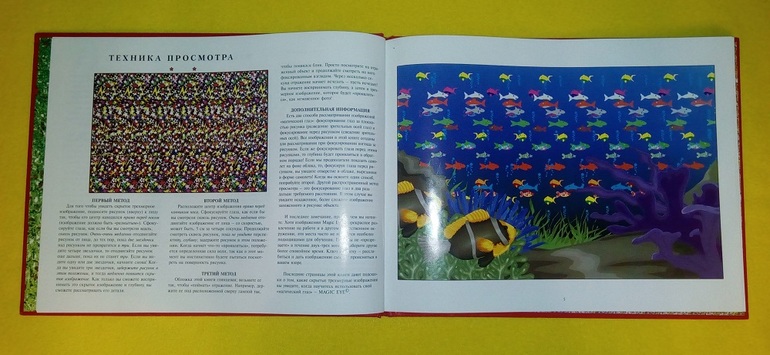 Последний раз я встречалась со стереограммами в детстве. Их печатали в местной газете и были они черно-белыми. Помню свой восторг, когда получалось увидеть 3D-изображение. Поэтому когда случайно наткнулась на книгу в "Лабиринте", ни минуты не сомневалась в покупке. А акционная цена в 220 рублей сделала это покупку вдвойне приятной.