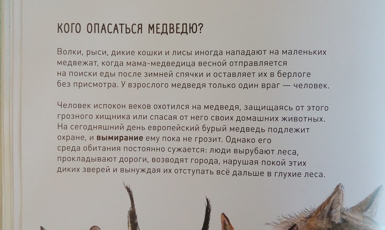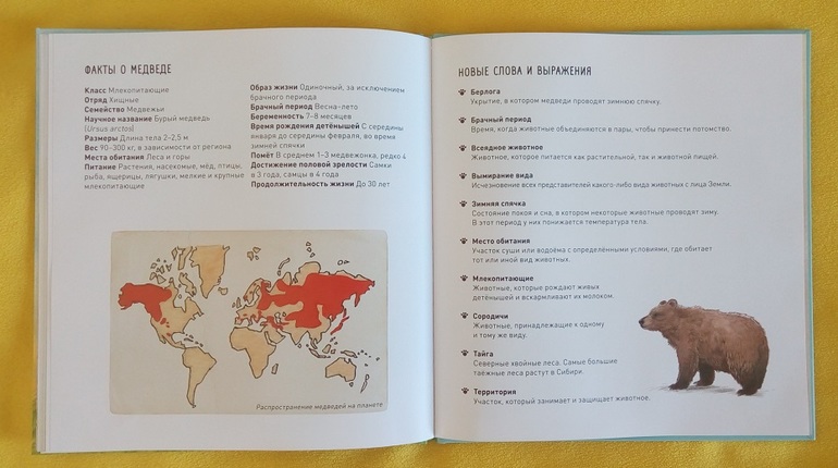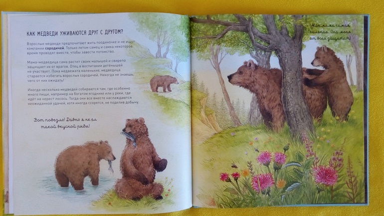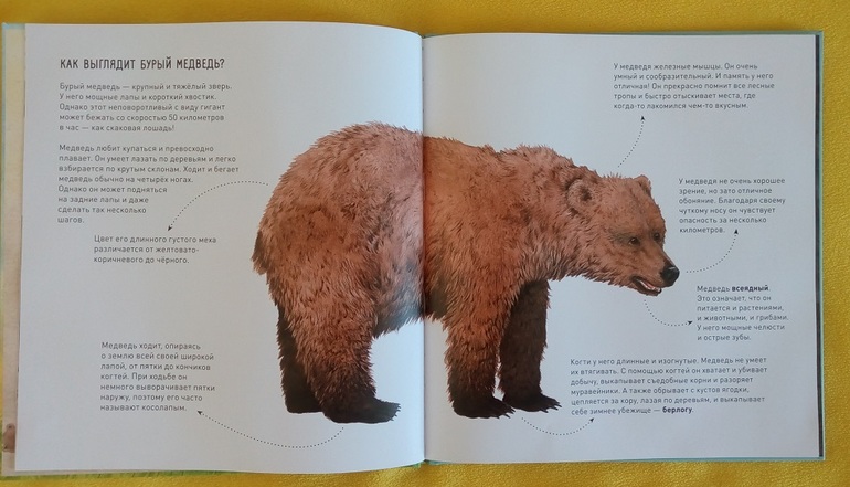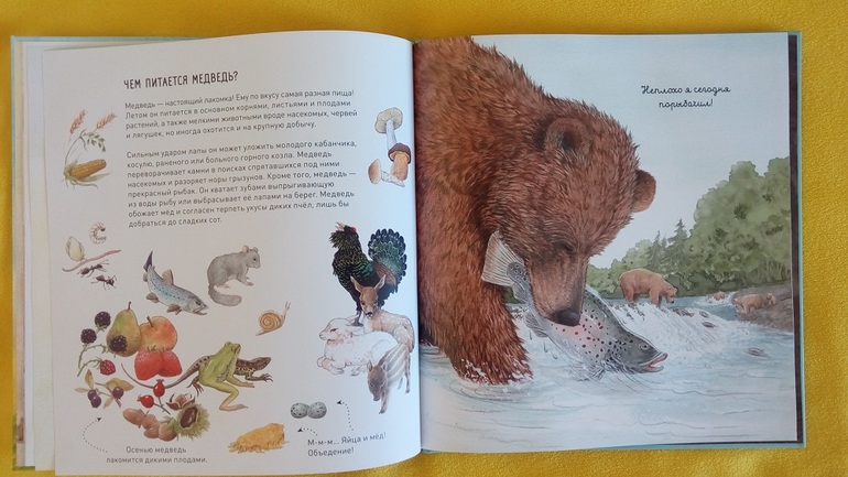 Любимый разворот младшего сына. Медведь ловит рыбку. Всегда бурно с ним обсуждаем трапезу косолапого. Кстати, чем мне нравятся две эти энциклопедии, тем, что они интересны и младшему (2 года) и старшему (8 лет) сыновьям. С младшим мы больше рассматриваем картинки, тогда как старший нам любим почитать факты. Особенно удачно этот процесс проходит во время вечернего чаепития, когда собирается вся семья и можно дружно обсудить услышанное.