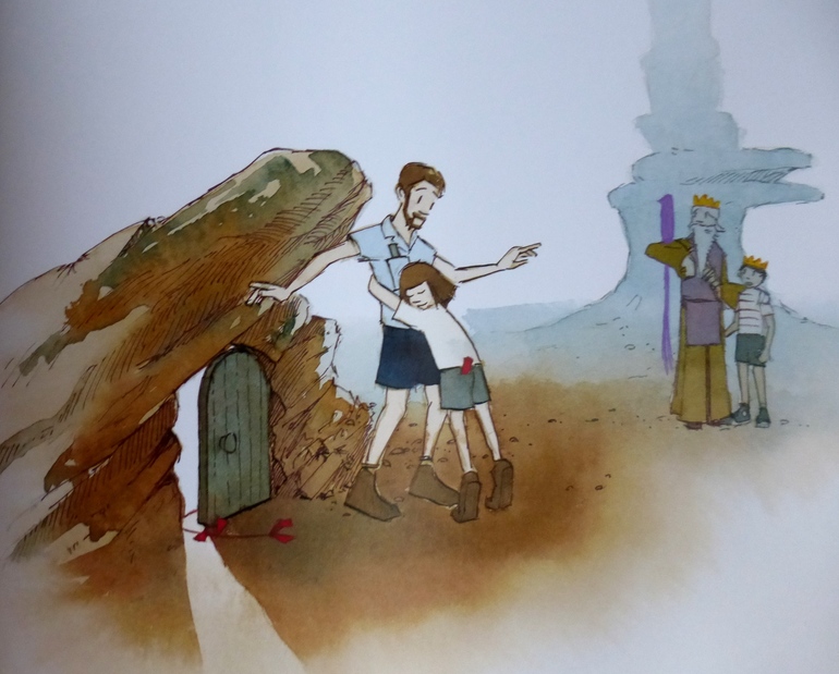 Девочка рисует все туже дверь. Дверь в яркий волшебный мир, полный чудес, приключений и опасностей. В книге заканчивается все хорошо, родительское сердце все-таки почувствовало свою ошибку. Иллюстрациями изображается, что отец девочки отправляется на поиски дочки и по ходу истории, вдвоем, им приходится стать одной командой, чтобы справиться со всеми трудностями, которые появляются на их пути благодаря смелости, находчивости и, конечно, любви.