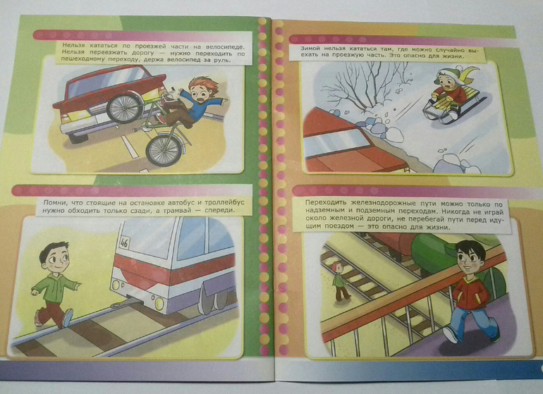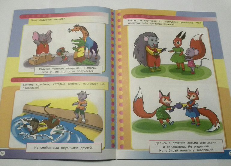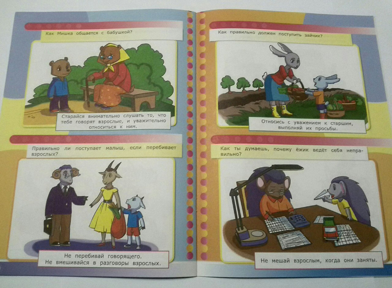Данное пособие тоже настраивает на беседу. Но каждая тема здесь начинается с вопроса ребенку, заставляя его тем самым задуматься, попытаться понять, почему что-то нужно сделать, а что-то делать нельзя. Дальше уже подключается взрослый, который читает ответ в книге и начинает более детальное объяснение, почему необходимо делать так, а не иначе. Главное помнить, что объяснения должны быть простыми и соответствовать действительности. Что правила могут быть разными в зависимости от окружения или обстоятельств и могут соблюдаться только в определенном месте. Нужно обязательно пояснить, почему было создано такое правило и что оно работает именно здесь, в данном месте и ситуации.