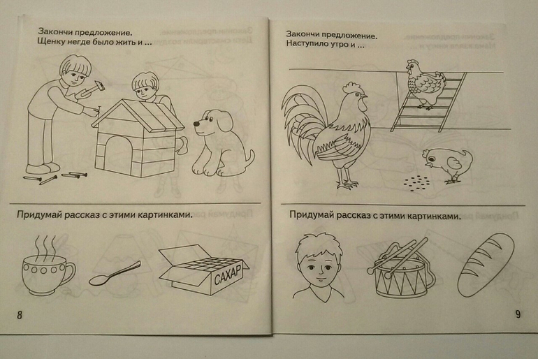 Упражнения в тетради однотипные, на каждой странице два задания. Ребенку нужно продолжить предложение, глядя на картинку и составить небольшой рассказ с использованием картинок в нижней части страницы. Для нас пособие оказалось очень полезным помощником в развитии связной речи, оно научила ребенка выражать свои мысли, обогатило словарный запас, научило понимать смысл изображения.