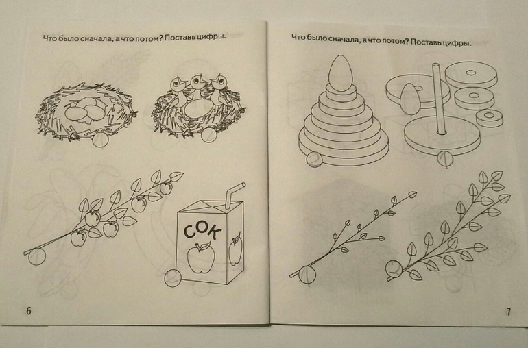 Еще одна интересная тетрадка.На первый взгляд простая, но заставляющая детей размышлять. На каждой странице два однотипных задания, нужно определить, что было сначала и что стало потом. В первую очередь необходимо попросить малыша внимательно рассмотреть картинку и попробовать описать увиденное.