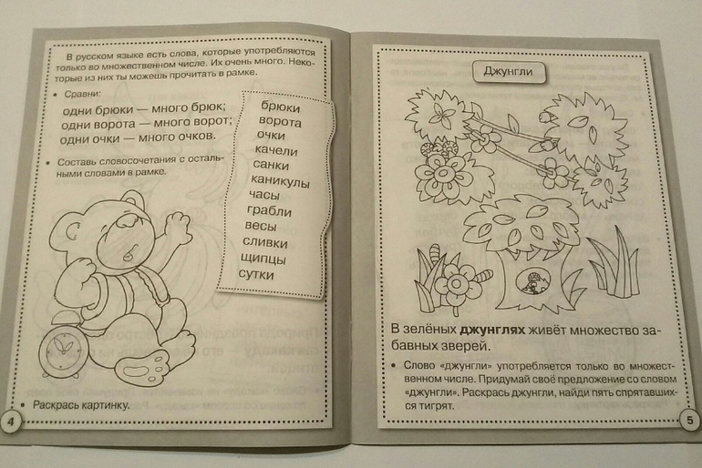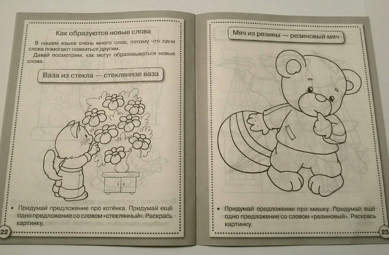 Данное пособие как раз предназначено для развития речи, для обучения ребенка правильно подбирать слова, составлять из них предложения, ставить ударение.Малыш узнает, что есть слова, которые не изменяются в зависимости от контекста "одно какао - три какао". Существуют слова, которые употребляются только во множественном или в единственном числе. Научится произносить фразы и предложения с разной интонацией. Поймет как образуются новые слова "мяч из резины - резиновый мяч".