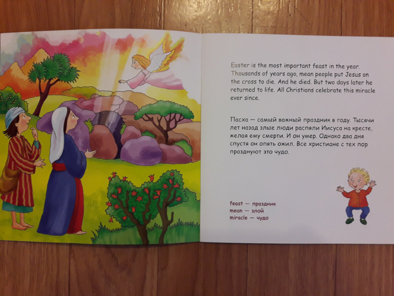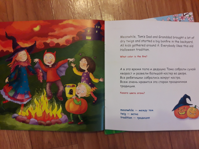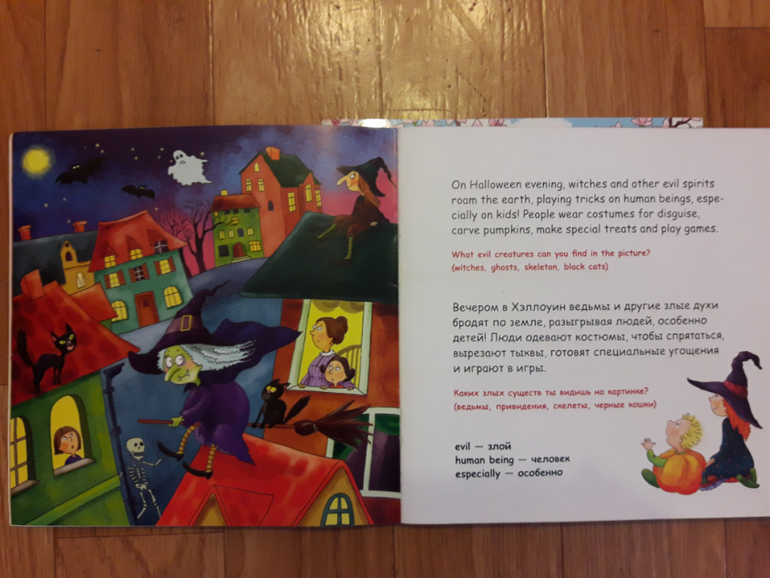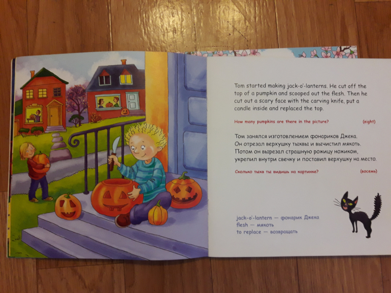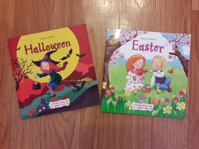 Ну и нароследок ещё две книги. Что тут скажешь... Очень добротные. Издательство "Карапуз", автор Мария Салищева. Мелованная бумага. У нас, к сожалению, только две книги про хэллоуин и пасху. "Halloween" уже прочитали. Ну а с "Easter " будем скоро знакомиться. Вообще, хотелось бы прочитать всю серию данного издания "английский с рождения", но отсутствует в продаже. Тут, конечно, текст замечательно изложен, также сопровождается русским переводом. Вообще данные книги позволяют ребёнку ознакомиться ещё и с культурой и с обычаями страны, язык которой изучает. На каждой страничке словарик и задания. Короче, сыну очень нравятся книжечки эти.