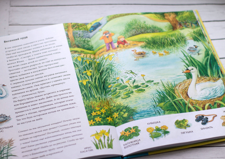 Мы обычно читаем с Варей по 2 разворота за раз, но на каждом детально обсуждаем, все что только можно найти на картинке. Здесь например, весенний пруд и его обитатели.