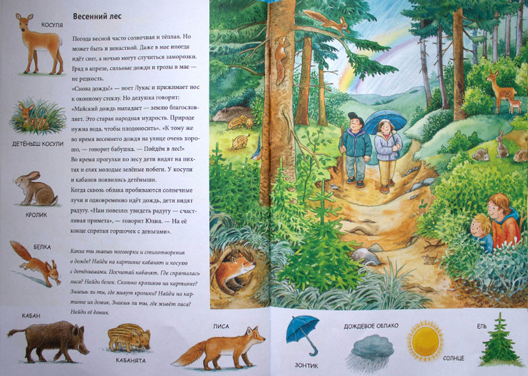 По порядку. В книге 12 разворотов, на каждом развороте крупная иллюстрация и по краям несколько небольших картинок, которые нужно искать, также есть небольшая заметка на тему. На картинках для поиска в основном растения и животные и несколько предметов.