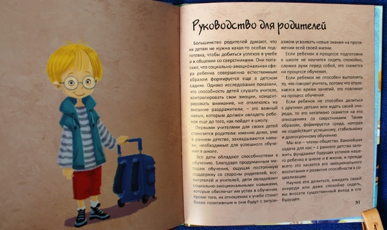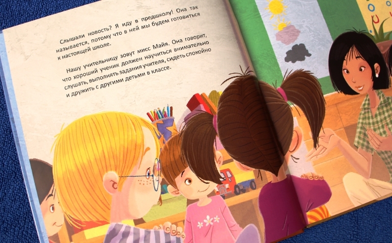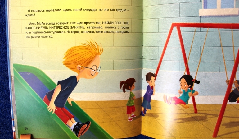 Текст составлен очень грамотно, продуманно. Во-первых, текста мало, только самая суть, каждое слово на своем месте. Во-вторых, решение идет сразу за озвученной проблемой (ребенок еще не успеет испугаться или забыть о чем речь). Текст приближен к «языку» дошкольника. И бонус: в конце книги целая страница для родителей понятно объясняет, зачем им стоит заранее потрудиться над усидчивостью, терпеливостью, внимательностью своего чада, а еще умению делиться и ждать своей очереди.