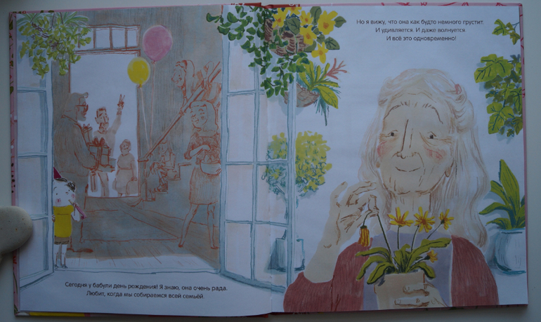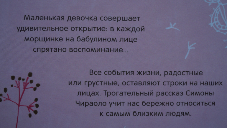 С недавнего времени меня стала беспокоить тема общения бабушки и внучки. Появилась в последнее время у нас проблема. Наша бабушка обожает внучку и пытается всякий раз ее обнять, потискать, поцеловать. А Алисия стала как-то уворачиваться, отворачиваться и избегать тесных контактов. Ничем не объясняет свое поведение, но мне кажется, что дело в возрасте бабушки, в морщинах. Я хочу, чтобы она обожала бабушку также сильно, как и бабушка ее. Я веду с ней душещипательные беседы на тему возрастных изменений, любви и уважения к старости. Но мне нужна поддержка. И эту поддержку я нашла в этой книге. Замечательно рассказана история жизни бабушки. Сколько ей пришлось пережить приятных моментов и горьких. Как они все ценны и дороги для нее. Любовь, расставания, встречи, радость общения и горечь от потерь. Это происходит со всеми. Произойдет и нашими малышами в будущем. Мы прочитали эту книгу с удовольствием. Текста мало, а мыслей и тем для обсуждения много. Я не могу определиться с возрастной категорией читателей. Для кого ее порекомендовать? Наверное можно начать такой разговор и с малышами. Но, как показал наш опыт, тема эта актуальна и в 7 лет. Желаю вам познакомить своих детей с этим изданием и поговорить о бабушках и дедушках.