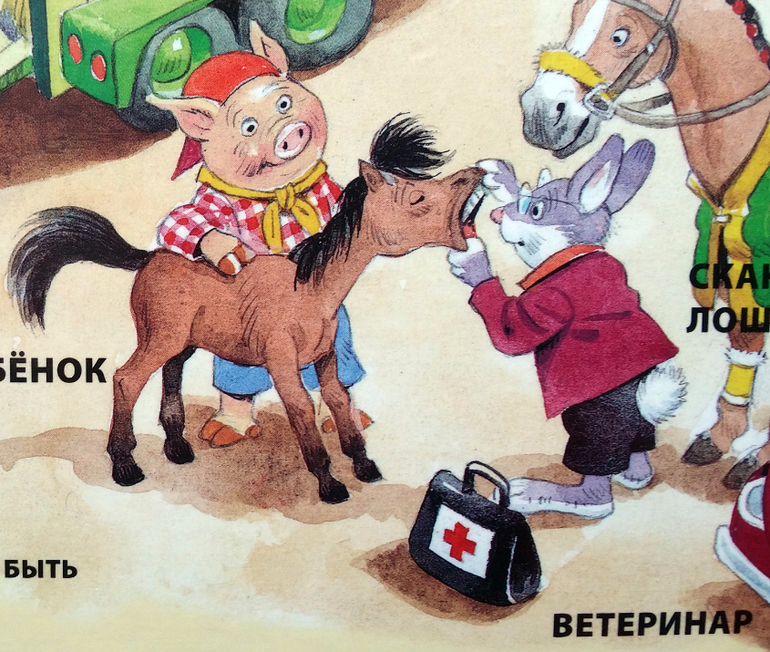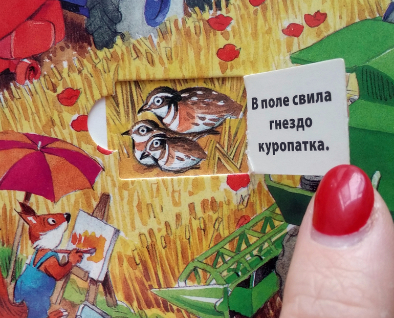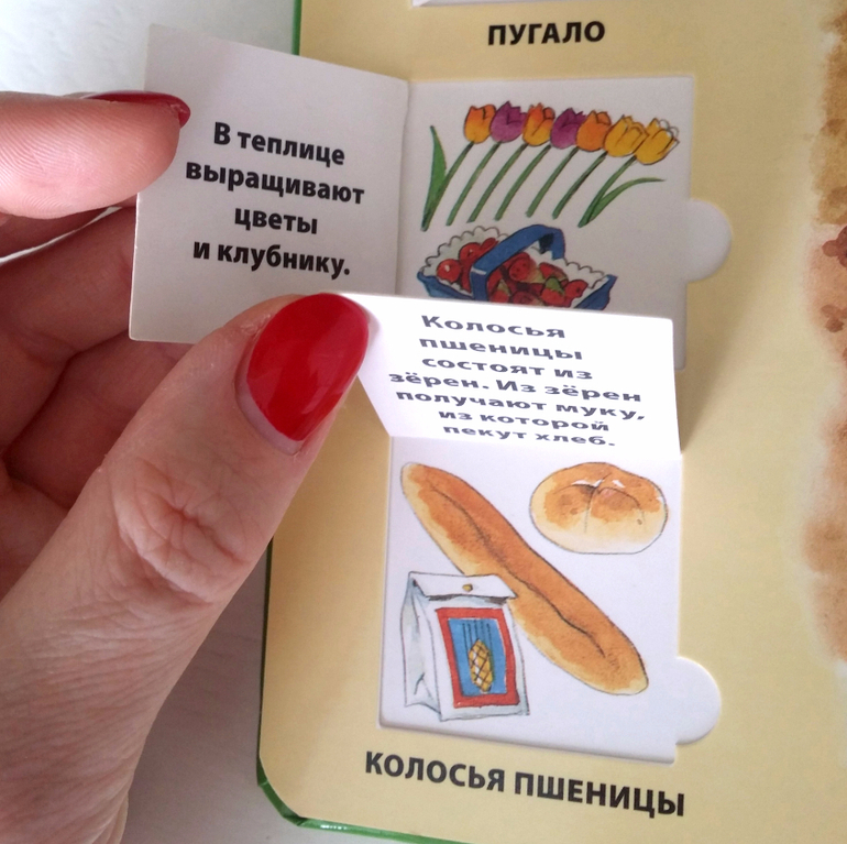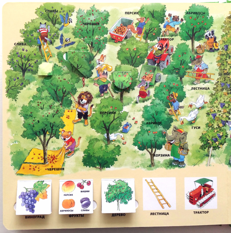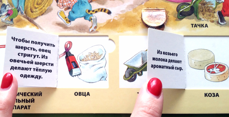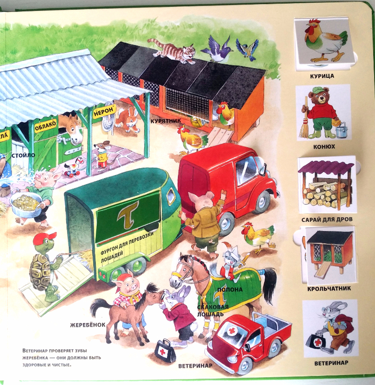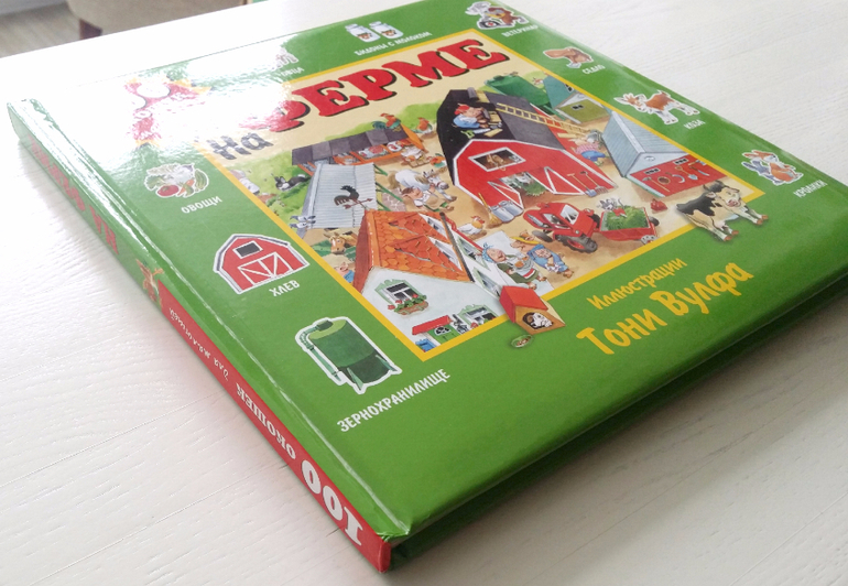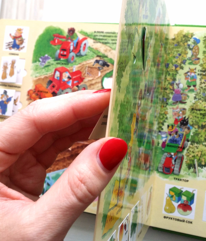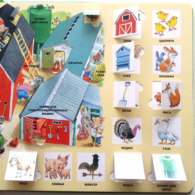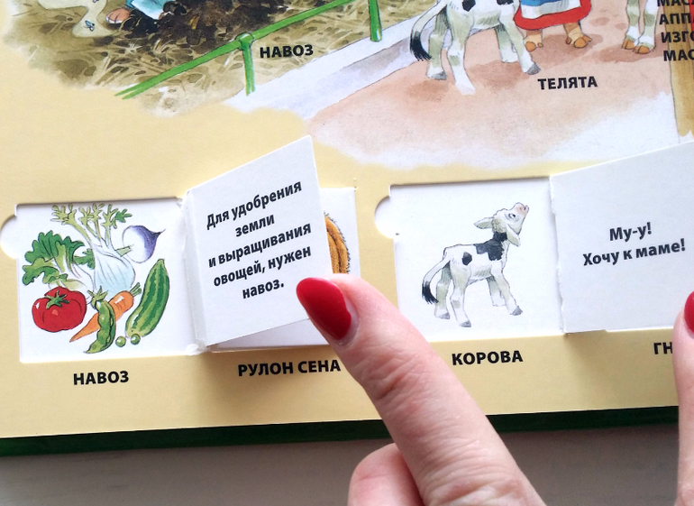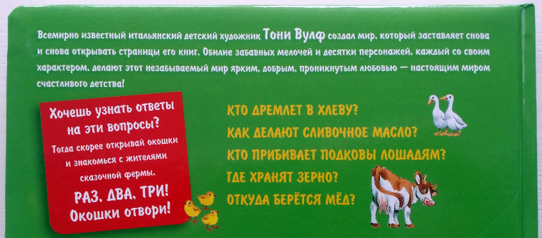 Книга большого формата, плотная мягкая обложка, 6 разворотов на разную тематику (двор, коровник, конюшня, огород, сад, лес), плотные страницы (помять невозможно), плотные картонные окошки (среднестатистический ребенок, не книжный вандал, не порвет), рисунки красочные, цвета приятные.