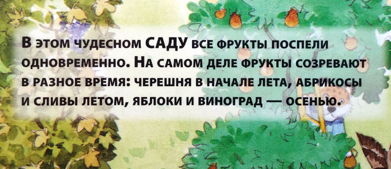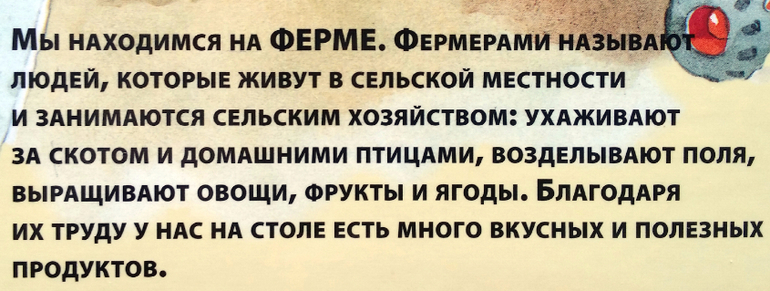 Приобрела, когда сыну был год, но равновато... Основательно достали ее в 1.4 года. И, думаю, до 4-5 лет точно будет актуальна. Конечно, сначала интерес появился к игровому элементу - окошками, и к животным, часть из которых сын уже знал, а вот где они живут, какую пользу приносят обществу - изучаем сейчас. В некоторых окошках есть более сложные объяснения, поэтому книга может служить энциклопедией по сельскому хозяйству для деток 4-5 лет. Также книгу можно использовать как гляделку, потому что на одном развороте собрано много разных ситуаций, и не без детского юмора (лиса ворует сыр из корзины у мишек на пикнике и т.п.).
