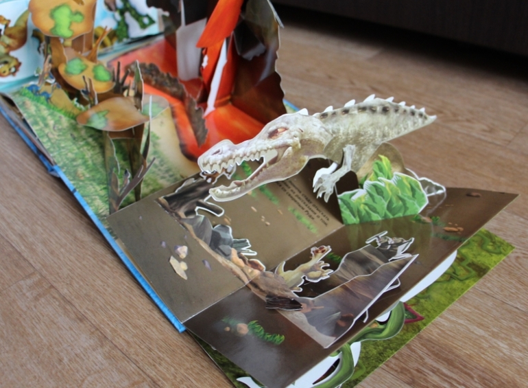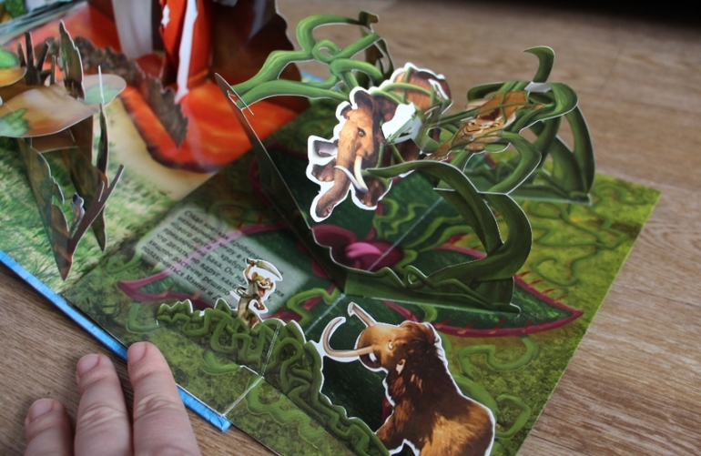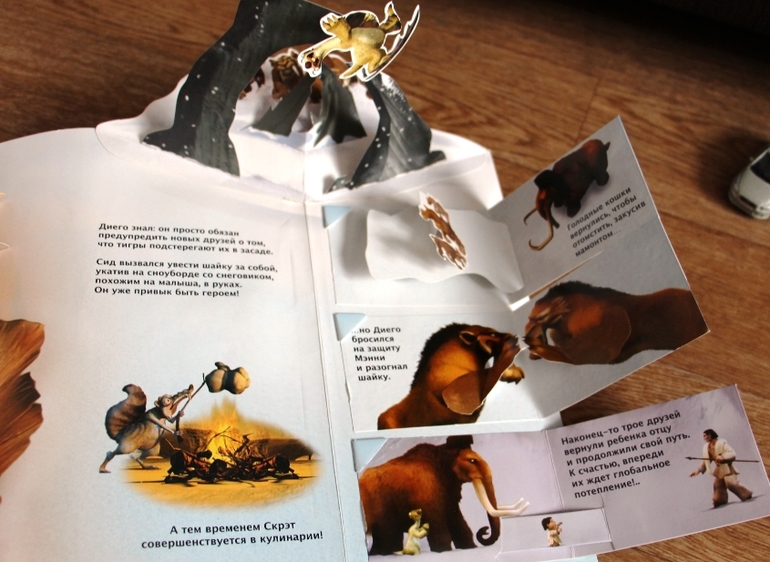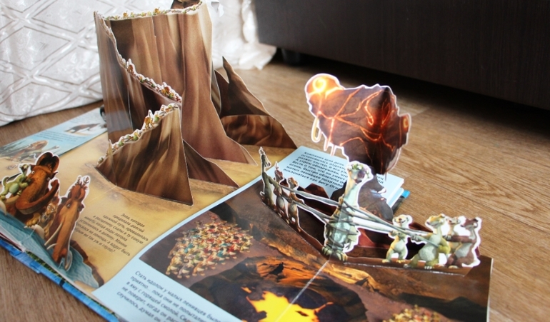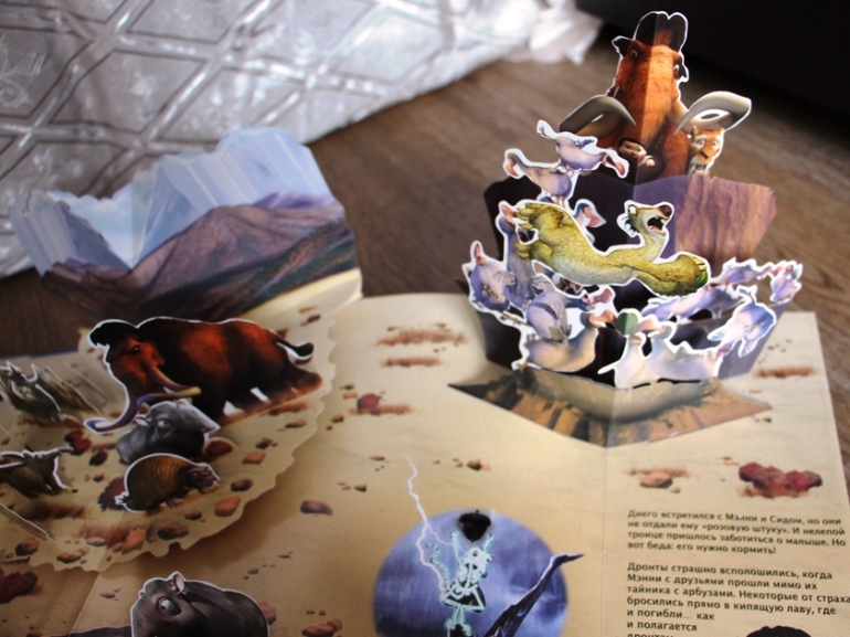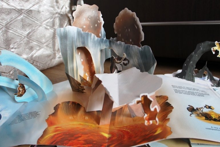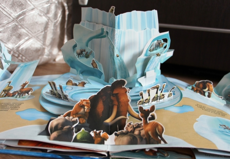 У нас есть обычные книги-панорамки (Колобок, Тараканище), в них как я разобралась, принцип действия - страница вырублена, согнута и вывернута вперед. В Ледниковом периоде каждая панорама многослойная - несколько слоев как-то соединены и если уж горы передо мной, то настоящие. )))