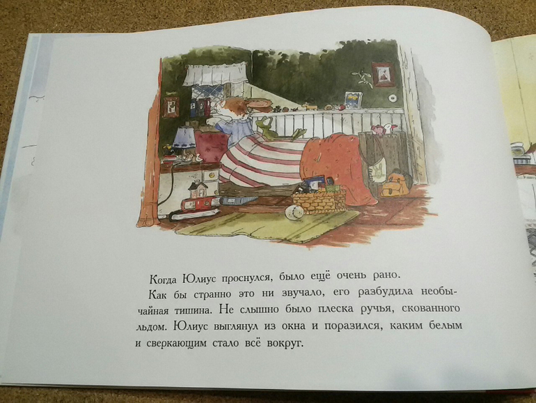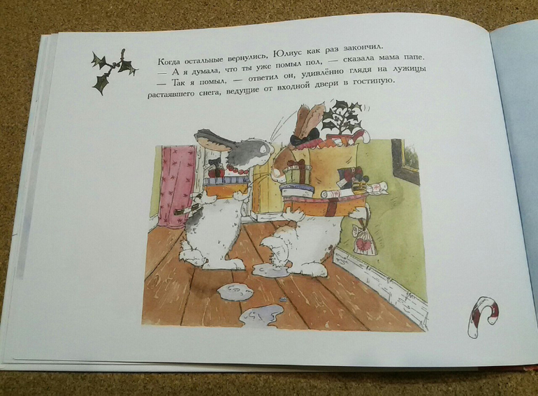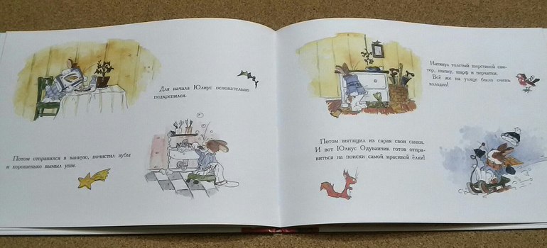Но для начала он основательно подкрепился и почистил зубы. И только после этого отправился на поиски самой красивой ёлки. Но он и не думал, что найти ёлочку будет так трудно. Он уже основательно замерз, когда увидел наконец идеальное деревце. Когда Юлиус втащил ёлку в дом, остальные были еще заняты покупками, и не найдя нигде ёлочных украшений, крольчонок понял, что нужно опять что-то придумать. В дело пошли красные яблоки, пучок морковки и несколько картофелин. Из макарон он соорудил ёлочную гирлянду, а на верхушку закрепил игрушечную уточку. Когда остальные вернулись, они застыли в удивлении, потому что действительно забыли про ёлку, и потому что "такой прекрасной ёлочки у никогда еще не бывало".