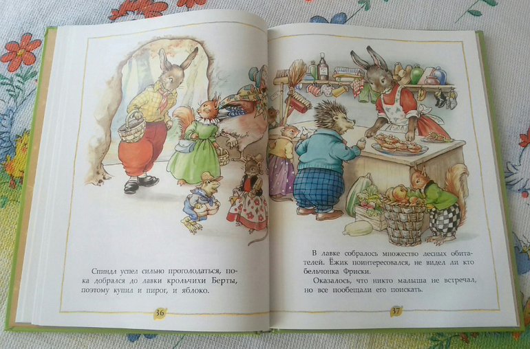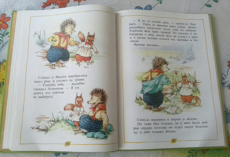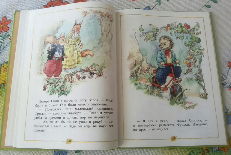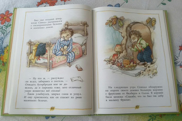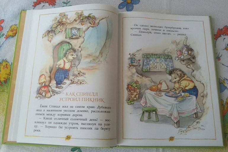 Вторая сказка моя любимая, в ней ежик Спиндл собирается устроить пикник на берегу реки. Доехав до реки, ежик встретил водяную крысу тетушку Винни, которая возвращалась из лесной лавки с тяжелой корзиной. Спиндл предложил ей воспользоваться его велосипедом, но совсем забыл, что оставил коробку с едой на багажнике.