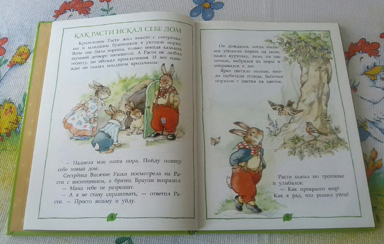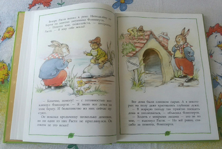 Всего в книге четыре небольшие истории. В первой - крольчонок Расти решает найти себе собственный домик. Он отправляется на поиски нового жилья. Но оказывается это не так просто. Мышиная квартирка в старом дубе оказалась для него слишком мала. Крольчонок оказался слишком тяжел, чтобы лазать по деревьям и жить в дупле. А все дома лягушек были слишком сырые. Расти был так расстроен, что даже расплакался.