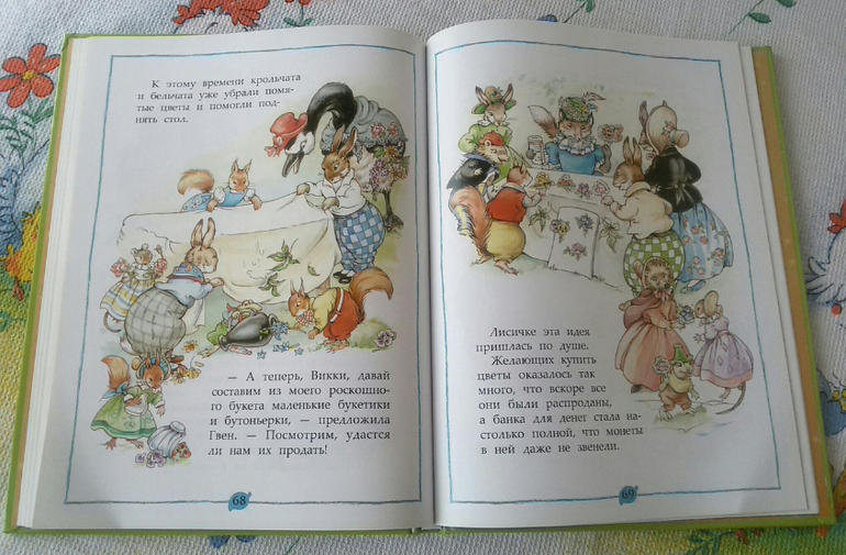 Третья история у нас была самая читаемая и обсуждаемая. Звери устраивают благотворительную ярмарку и по этому случаю лисичка Викки собирается надеть новую шляпку. Однако сильный порыв ветра сорвал шляпку с головы лисички и уронил прямо в реку. Головной убор был безнадежно испорчен, а Викки была безутешна. Но друзья пришли на помощь , они нарвали полевых цветов и длинных листьев, и сплели чудесную зеленую шапку. Лисичка была в восторге от новой шляпки и вместе они отправились обустраивать свои столы для предстоящей ярмарки.
