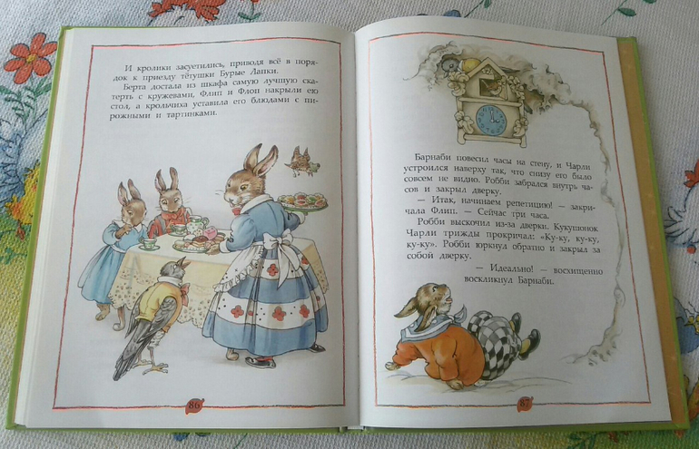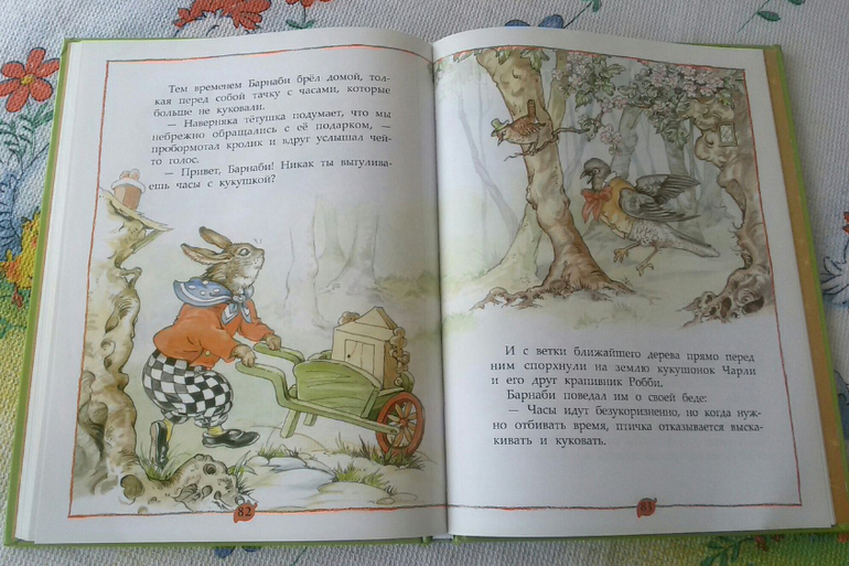 Вроде бы что в этом удивительного? Но кролики совсем не хотели расстраивать любимую тетушку, которая подарила им замечательные часы с кукушкой, и которые крольчата нечаянно сломали. Поэтому папа кролик поставил тяжелые часы в тачку и повез их к часовому мастеру старику Колючкину. Но даже он не смог их починить. На обратном пути кролик встретил кукушонка Чарли и крапивника Робби. Чарли предложил залезть на самую верхушку часов и в нужный момент прокричать "ку-ку", а Робби в это время выскочит из дверки, будто он деревянная птичка.