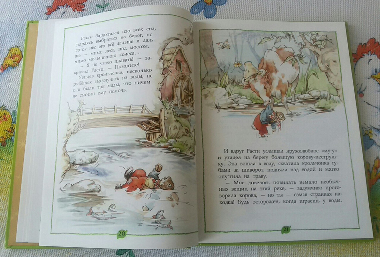 Хорошо на берегу паслась большая корова, которая вытащила крольчонка из холодной воды. Расти рассказал ей о своих приключениях и мудрая корова пообещала отвести его к домику, которой отлично ему подойдет.