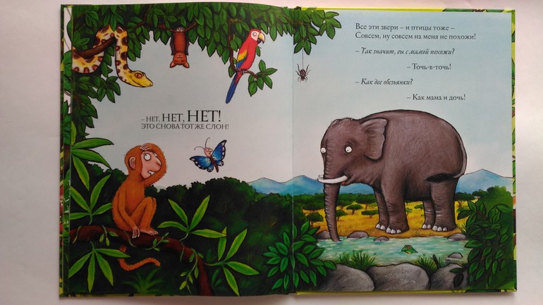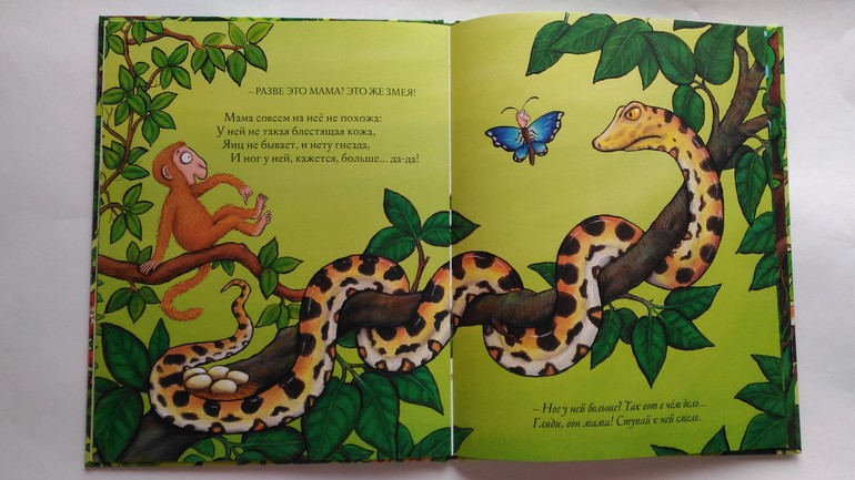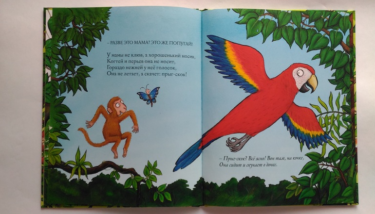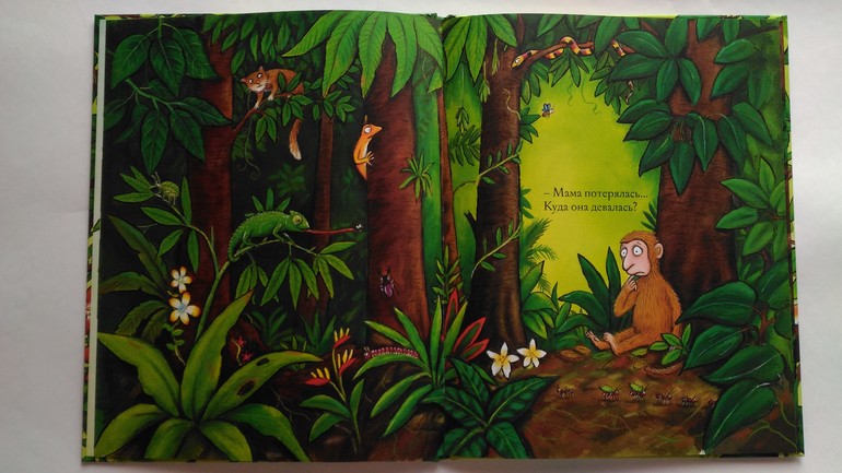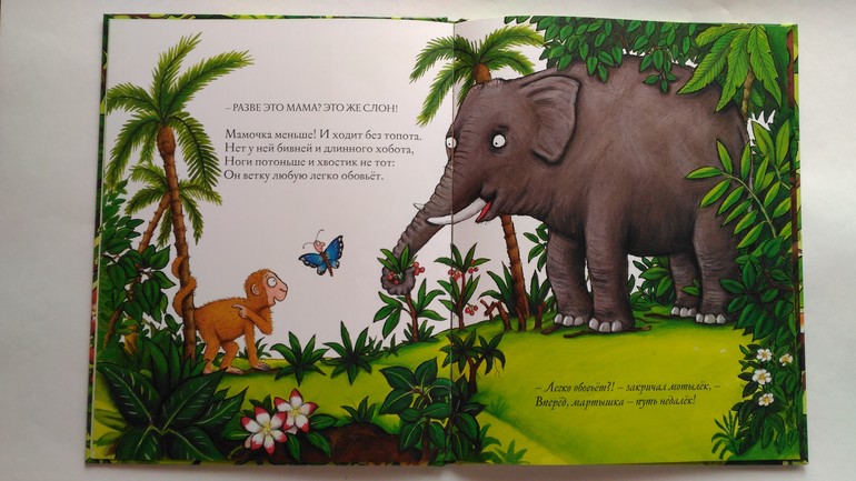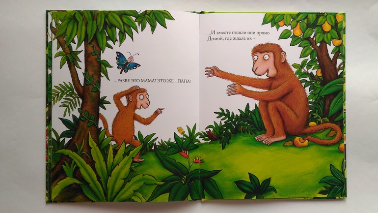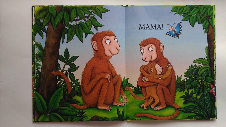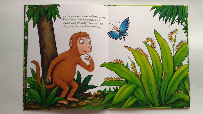 В принципе, мне бы хватило и этого, просто мама могла бы вынырнуть из-за какого-нибудь тропического куста. Но у Джулии Дональдсон развязка гораздо более веселая и оригинальная. Оказывается, мотылек судил с высоты своего опыта, считая, что раз его детки-гусеницы, то и у мартышек должно быть нечто свобеобразное: