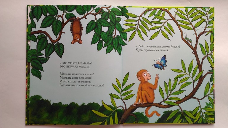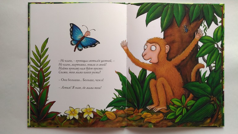 Очень красивая, на мой взгляд, книга. И пусть в ней довольно самобытные иллюстрации, которые не всем приходятся по вкусу. Не зря Аксель Шеффлер стал в некотором роде классиком современной детской иллюстрации. Какие живые и добрые здесь персонажи, какой красочный и яркий тропический лес! А какие приятные, веселые, озорные и сочные стихи! Хоть книга и достаточно объемна, запоминается текст очень быстро. (Отдельное браво переводчику М. Бородицкой). За счёт того, что вся сказка рассказывается от первого лица по ролям мотылек-обезьянка, очень здорово получается разыгрывать сюжет, меняя интонации голоса, что делает чтение этой книги еще только интереснее.