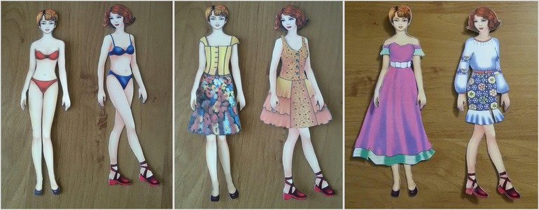 Поскольку каждая кукла находится в своей позе, одеть ее можно только в одежду из ее книжки. Разворот плеча, положение рук не позволят им меняться нарядами. Но для каждой представлено столько одежды, что если даже отбросить немного старомодные, хватит очень надолго для самых разнообразных игр. Наряды из плотной бумаги. И если не считать того, что смяли маленькие пальчики и того, до чего все-таки добрался кот, у нас все в наличии, все носится. Но как любая уважающая себя бумажная кукла, она не может постоянно носить одно и тоже. Когда нам надоест вся имеющаяся одежда, будем фантазировать и самостоятельно создавать красивые наряды и платья.