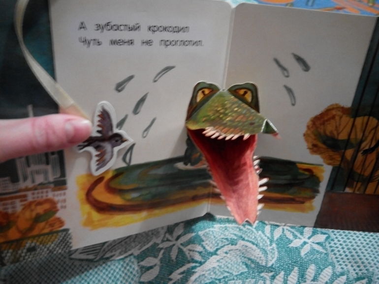 Заливисто хохочет и требует ещё и ещё. На остальные страницы и смотреть не хочет. Хотя я стараюсь обыграть каждую страницу и показать каждого зверя во всей красе. Но ему пофигу, он убирает мою руку с воробьем на ленточке и листает до крокодила 😂