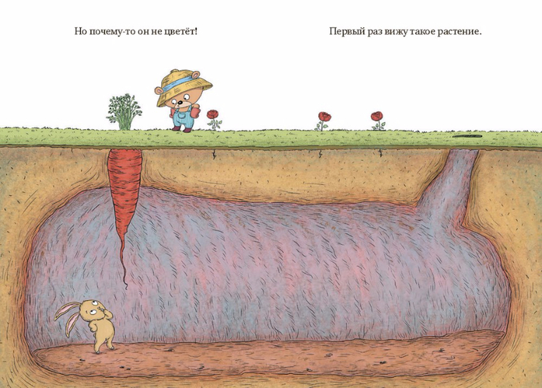 В книге два параллельных мира. Наземный мир - это история о маленьком трудолюбивом мишке-садовнике, который мечтает о том, как его большая и прекрасная роза будет цвести. Он не просто мечтает, он всеми силами пытается ей помочь и никак не поймет, в чем же дело? Что-то здесь не так! Роза никак не хочет цвести! Но что же именно?! Второй мир - подземный - это история о компании кроликов, которые нашли оооогромную морковку и устраивают себе самый настоящий пир горой! Спросите, при чем тут морковка? Да-да, это мишка-садовник все перепутал, у него в саду растет совсем не цветок, а самая настоящая морковка.