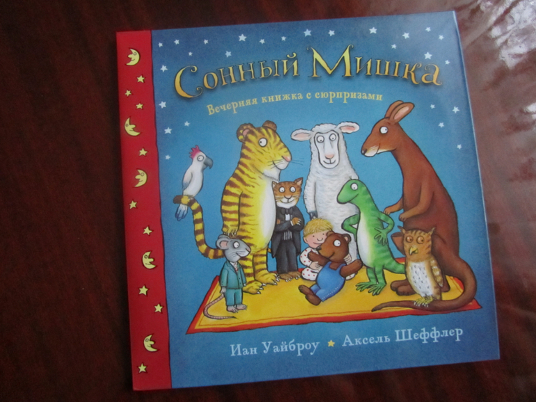 Книга конечно дорогая, но она мне кажется того стоит )). Безусловно стала хитом у сыночка со всеми этими окошками, клапанами. Честно признаюсь, стих сам сын особо не слушает, а мне приходится "читать" от себя про всё, что спрятано за этими окошками-сюрпризами )). Сюжет простой очень, про то как мишка спешит попасть домой ко сну малыша, а разные животные ему помогают успеть. И мы кстати не рассматриваем эту нкигу, как засыпательную (наверно ещё и потому, что текст особо не читаем), а просто в течение дня сынок по несколько раз носит мне её читать.