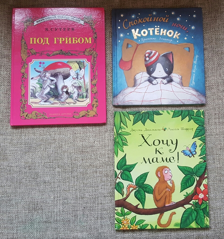 Ну и напоследок, наша единственная пока Дональдсон, замечательный Сутеев и засыпательная книга "Спокойной ночи, котенок" (текст короткий, понятный, и иллюстрации, на мой вкус, чудесные).
