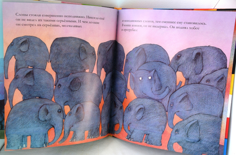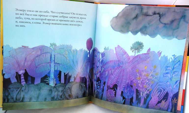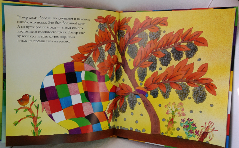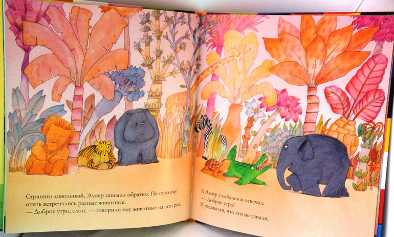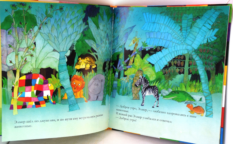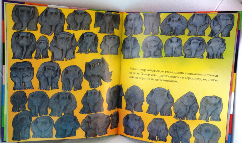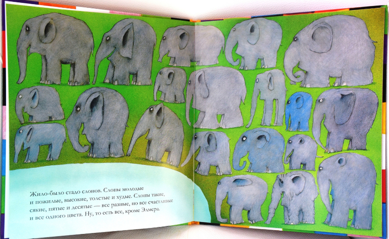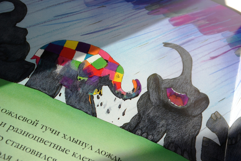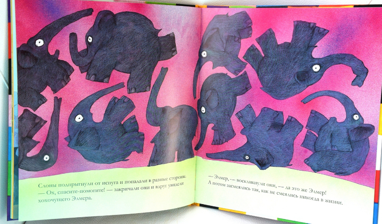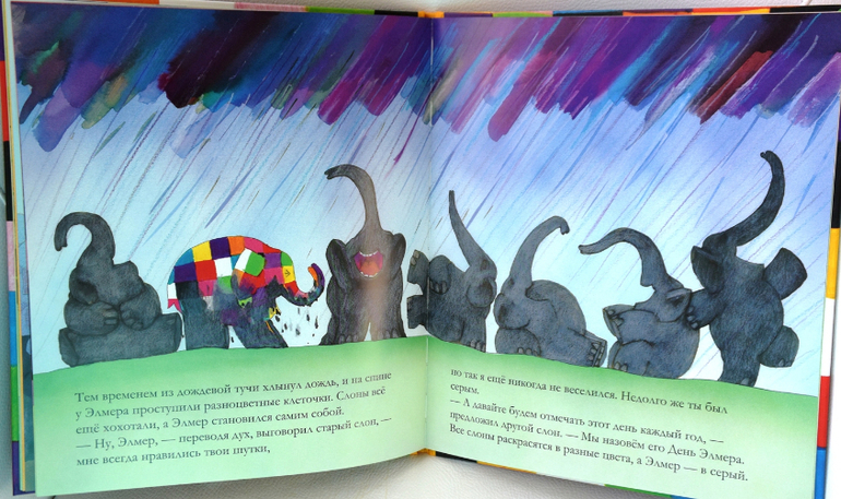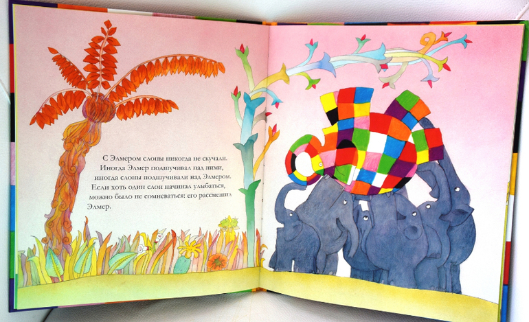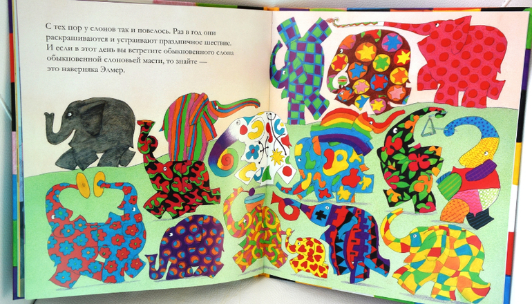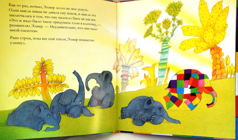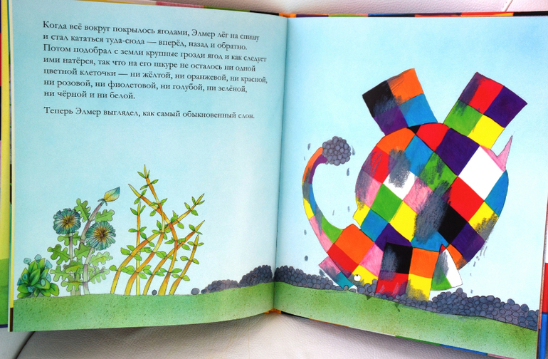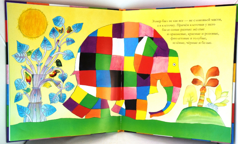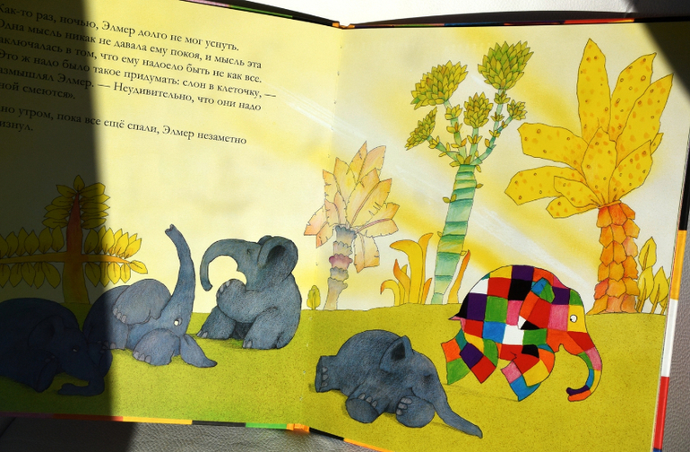 Хотелось сказать, что "Элмер" - это первая книга, которую дочка в свои 2 года выбрала в магазине самостоятельно. Сейчас же думаю, что это Элмер нас выбрал. Сам в детские ручки влез, серую уличную слякоть окрасил в яркий взрыв красок и настроение поднял. Он не такой как все, не слоновьей масти. Он покорил своими разноцветными клеточками.