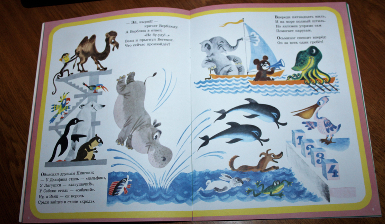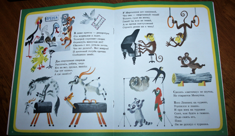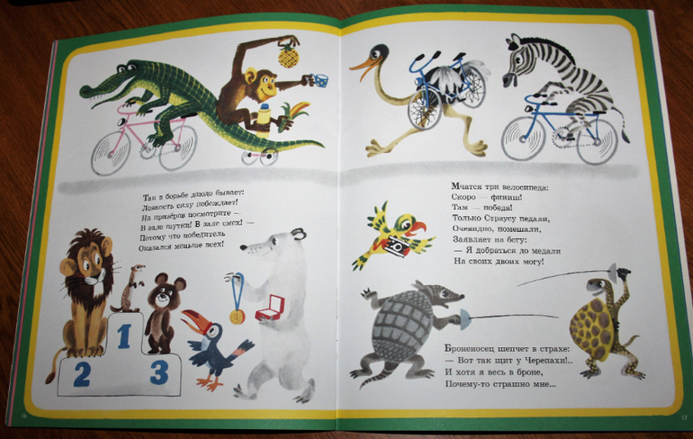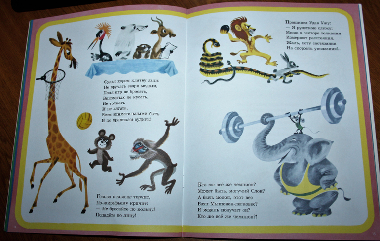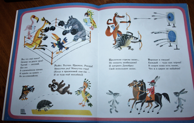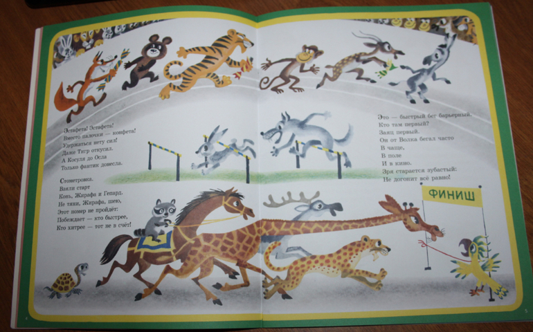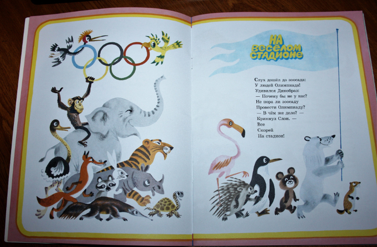 Книжка очень весёлая, рассказывает про то, как звери решили устроить свою олимпиаду. Они соревнуются. Про каждый вид спорта рассказывается кратко в стихах, а к каждому стихотворению идёт ещё и иллюстрация. Так что это книжку можно смело начинать читать лет так с двух) Если ребёнок уже начал слушать стихи.