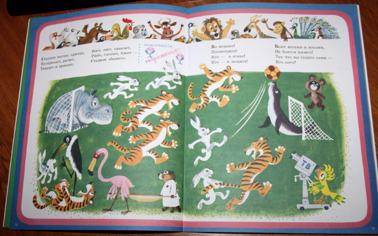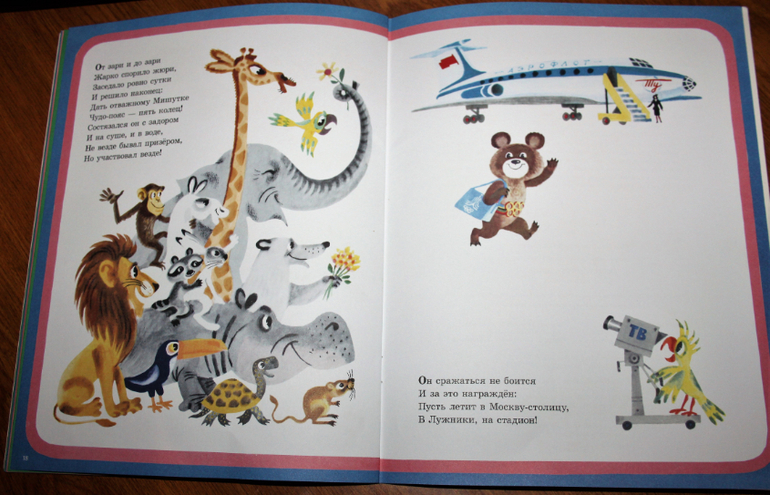 Все соревнования проходят в очень дружественной обстановке, для меня это было важно, чтобы показать сыну как важна дружба на соревнованиях, он ведь у нас частый участник беговелогонок. В конце книги олимпийского мишку отправляют в Москву-столицу, в Лужники на стадион.