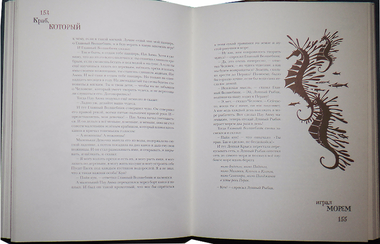 Хочу сказать, что книга, несмотря на объем и богатое содержание, легкая по весу, странички толстенькие и приятные на ощупь, но невесомые. Все потрясающе в этой книге. Рисунки ни к коем случае не забирают на себя сказочную жизнь, а лишь намекают по краям и в середине об ее атмосфере. Рисунки оригинальные, как бы теневые. Шоколадного цвета медузки, рыбы зубастые, рогатые "пра-пра-пра-пра-Коровы", смешные танцующие человечки (помните, как у Конан Дойля тоже танцующие человечки, он мне тут вспомнился из-за похожей влекущей интриги, объединяющей эти непохожие произведения именно в транскриции страниц ЭТОЙ книги!); есть картинки и на всю страницу, тоже шоколадного цвета, тоже сумашедше изящные и подходящие тексту.
