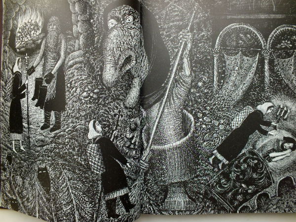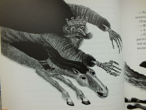 Иллюстрации монохромные, фактурные, они очень подходят сказкам. Кстати, есть у меня еще один сборник сказок с Забирохиным, там иллюстрации на офсете, смотрятся очень плохо. Здесь - меловка, качество - отменное, смотреть - одно удовольствие. Считаю, что подобные иллюстрации нужно на соответствующем уровне и печатать. Опять же: тут все сошлось воедино.