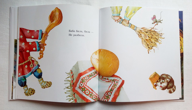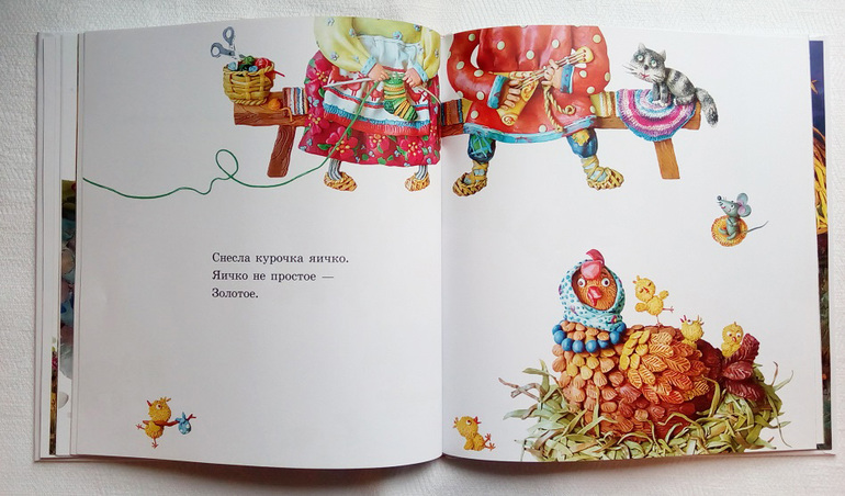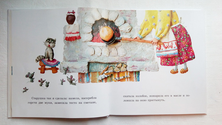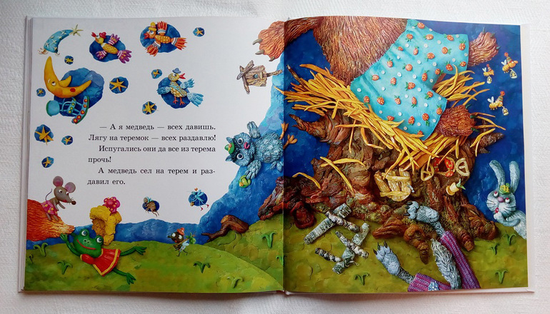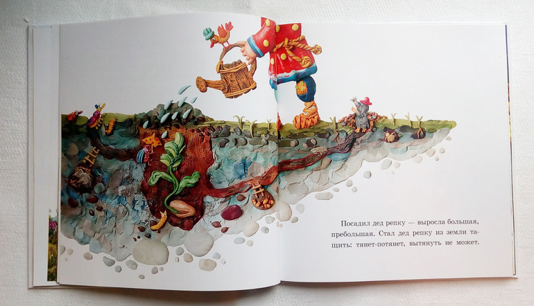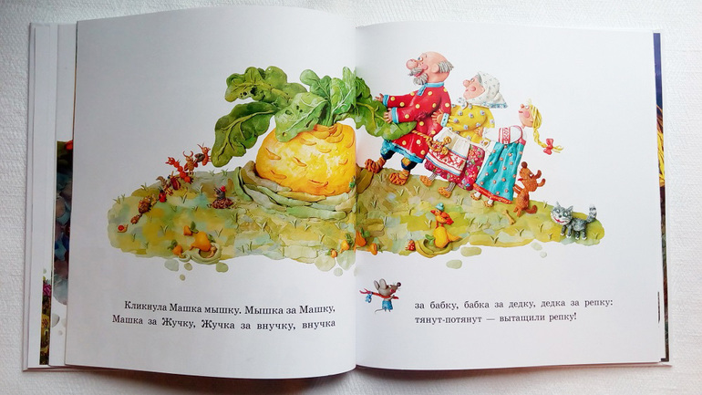 Вся в предвкушении красоты после разглядывания иллюстраций на "Иллюстраторе" я сперва была слегка разочарована. Не удалось издательству при печати передать те же цвета, что в первоначальном варианте, кое-где пострадала четкость изображения. Но чего горевать, не с компьютера же показывать ребенку книжку? Ну, получится медведь чуть с фиолетовым оттенком, не беда)) Ребенок его признал и вообще отнесся к книге с большим интересом. А ведь перед покупкой было у меня одно опасение. На некоторых разворотах дед и бабка предстают не в "полный рост" (как на вот этой фотографии). Сама не люблю фотографии, где людей случайно обрезают. Но тут не случайно, тут намеренно, чтобы на передний план вышли другие мелкие детали. Так вот боялась я, что ребенок не признает who is who, но мой двухлетний карапуз на вопрос "где баба? где деда?" четко указал на них. Вот и чудненько!