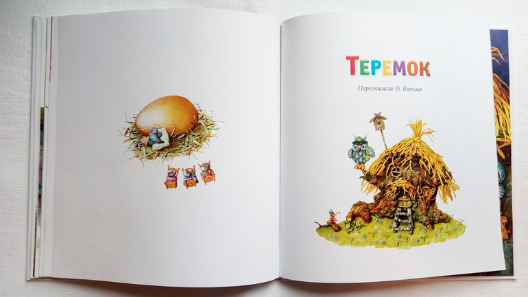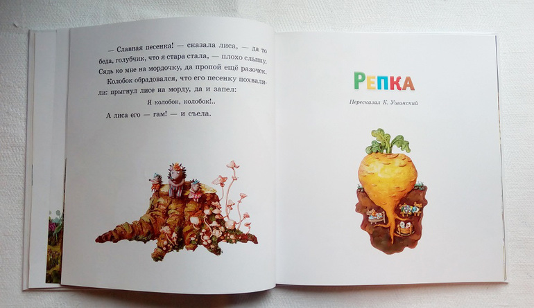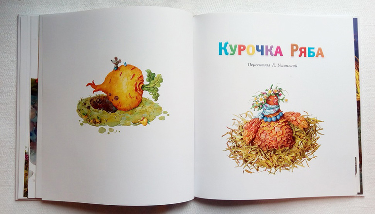 В книге четыре сказки: "Колобок" , "Репка" и "Курочка Ряба" в пересказе К.Ушинского и "Теремок" в пересказе О.Капица.