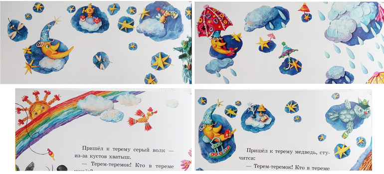 Помните ежиков из сказки "Колобок", которые перекочевывали из страницы в страницу? А в "Теремке" чудесная "погодная" история разворачивается. Одну ночку месяц чаевничает, а на другую укрывается от дождика, а далее наступает мемуарное настроение... Рассматривать одно удовольствие! А уж обсудить с ребятенком, как без этого?