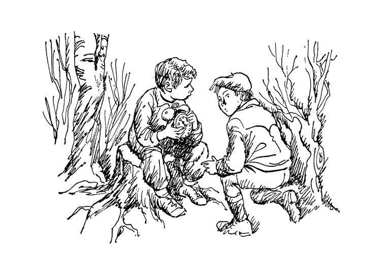 Но ребята, хоть и переволновались, будильник все же забрали и спрятались в лесу. От домов они ушли довольно далеко, решив закопать свою добычу в лесу, и какое-то время выдержать, чтобы история с пропажей слегка забылась. И пока они все это обсуждали, будильник начал звонить...