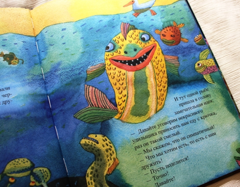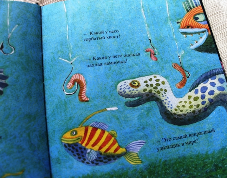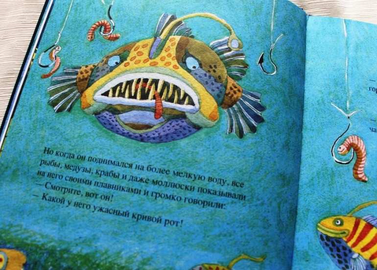 Рассказ очень интересный, затрагивает серьезные проблемы, такие как зависть и лесть, обида на оскорбления. Детский мозг моего ребенка очень удивило, что удильщика дразнят его внешностью. Он сказал, что удильщик зря выплыл из своих глубин к другим рыбам, что они злые. Довольно сложно мне оказалось объяснить ему, почему так происходит. Но зато мы поговорили, как же неприятно удильщику и что не следует вести себя так, как эти рыбы.