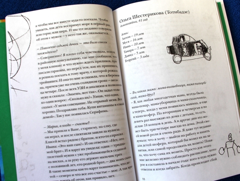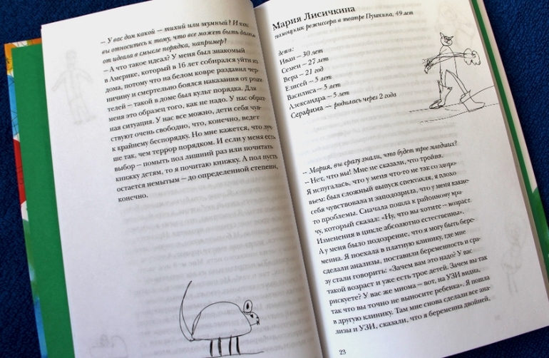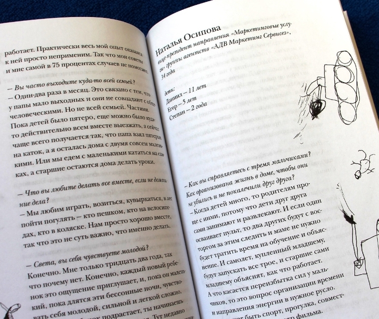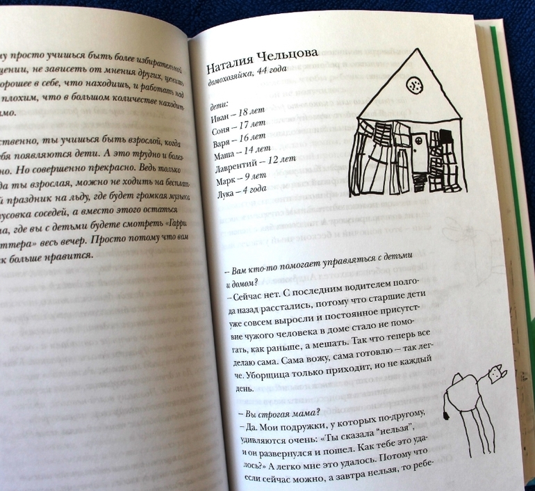 Сначала я удивлялась - как это они никогда не кричат на детей (я искала это в каждой следующей истории). Думала - умалчивают, книга же. А к последним страницам начала понимать: они все ищут и находят свой способ как не кричать - иначе просто не выжить, когда детей становится больше.