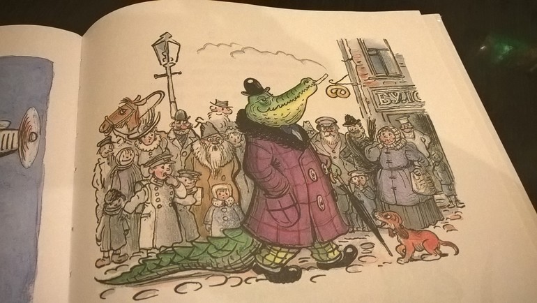 Крокодил Чуковского на фоне булошной. Ил. Сутеев