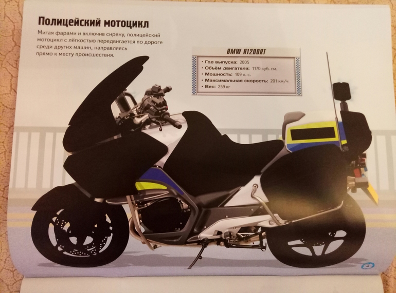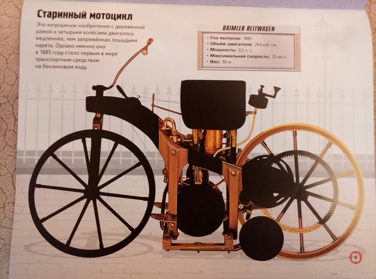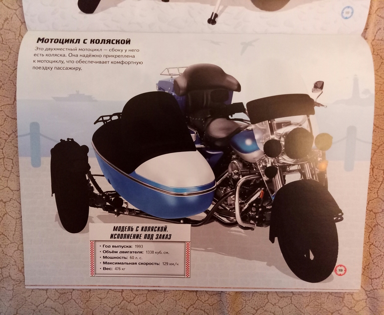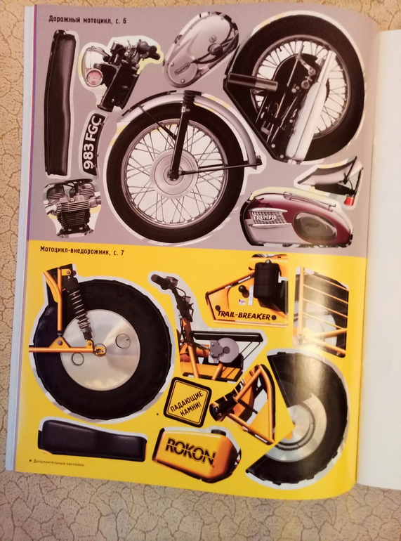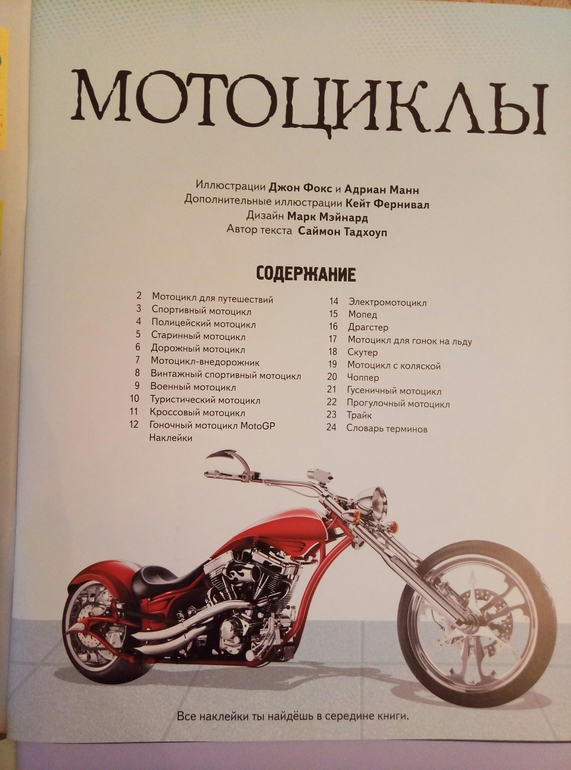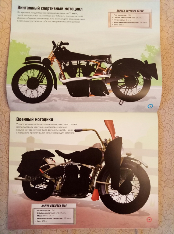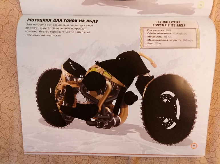 это тайная страсть нашего папы) когда по весне на дороге появляются эти железные агрегаты, наш папа только мечтательно вздыхает, вот придет время и я себе тоже куплю) сейчас, правда, это звучит Вот сынок подрастет, и тогда точно куплю ему.. Вы, наверно, можете себе представить, ЧТО думаю я в этот момент) а для начала пусть вместе клеют и изучают) там есть что поизучать) и каких только мотоциклов нет в этой книжке! И старинные винтажные, и супер современные, и даже с огромными шипованными колесами специально для езды по льду!