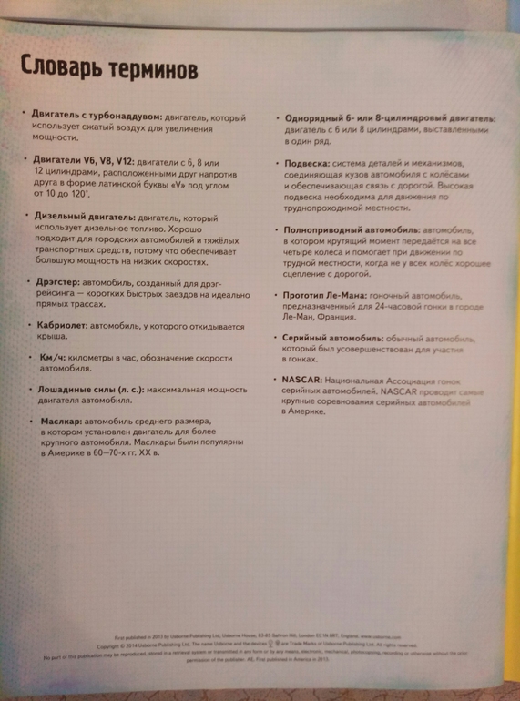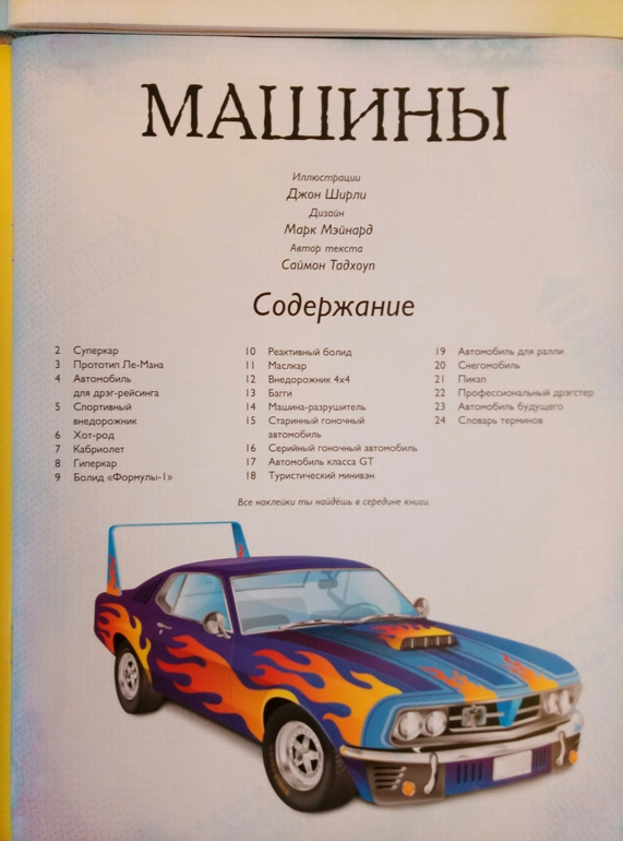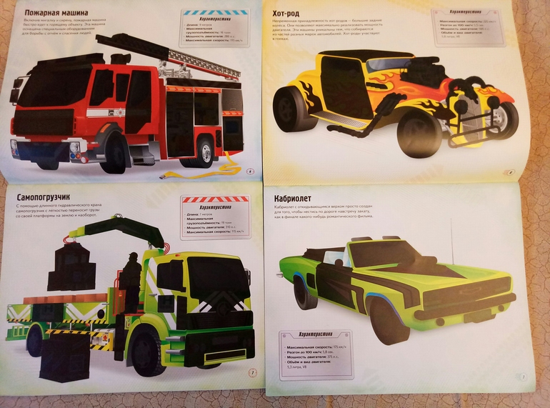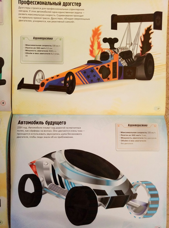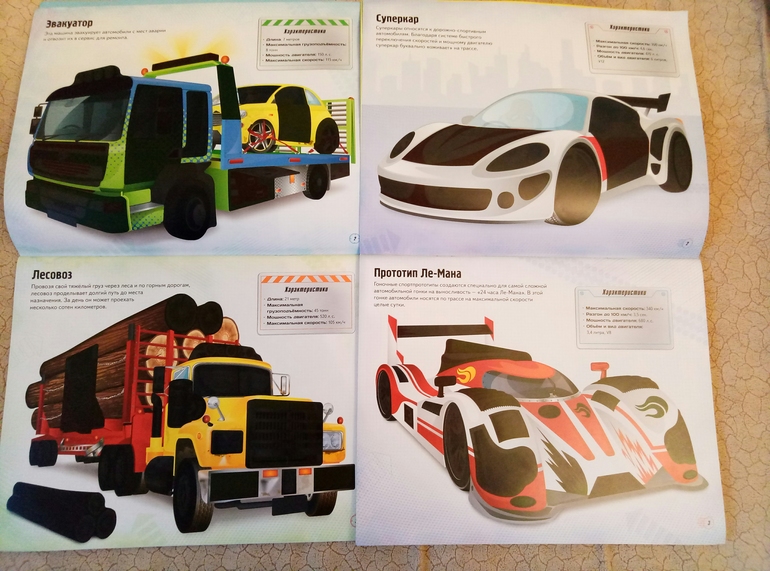 Ну и естественно, почти сразу были куплены Машины) В книжке представлено 22 машины. Рисунки яркие, про каждую машину есть небольшая информация и характеристика: максимальная скорость, разгон до 100 км/ч, мощность двигателя и объем и вид двигателя.