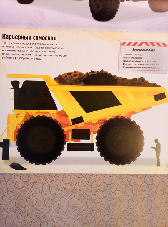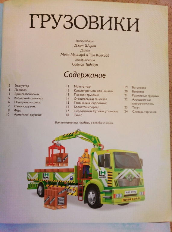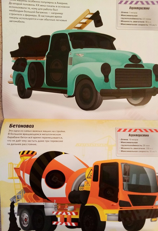 Сын еще любил кататься на коляске, и мы часами гуляли на даче по округе. А на дачах то постоянно где то что то строят, и поэтому очень часто встречались на нашем пути грузовики, камазы и бетономешалки. И мы замирали) и часами могли глазеть) Поэтому маме срочно понадобилась книжка с какой нибудь информацией, чтоб заполнять тишину) ну а малышу просто понравилось листать)