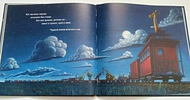 Иллюстрации в размытых, приглушенных тонах завораживают, успокаивают, настраивают на сон. Текст по певучести схож с книжкой про стройку, к нему тоже нужно приноровиться. Зато сейчас я лежу с закрытыми глазами и нараспев рассказываю стихотворение. Ребенок только успевает страницы перелистывать. Мы часто рассматриваем как озорные мартышки расставляют и закрепляют в вагонах все, что крутилось и катилось. Как слоны закачивают в цистерны краски, а белые медведи с пингвинами раскладывают в рефрижераторе аппетитное мороженое. Загрузили в поезд все: от игрушек до динозавров. Славно звери поработали и очень утомились.